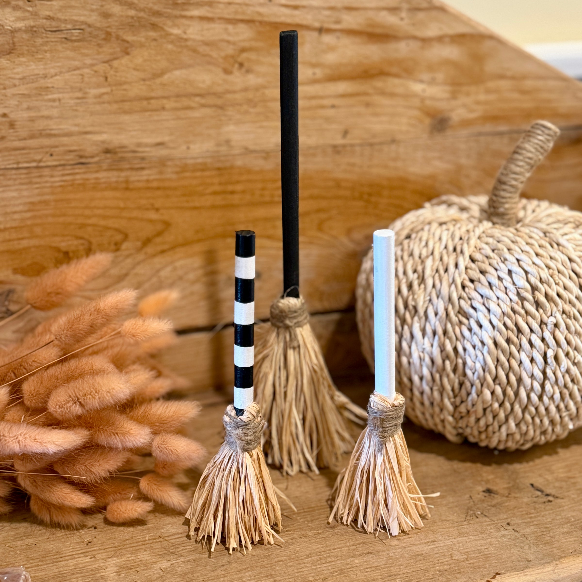Black Washed Wood Broomstick with Jute Wrapped Around Natural Thin Raffia Bristles