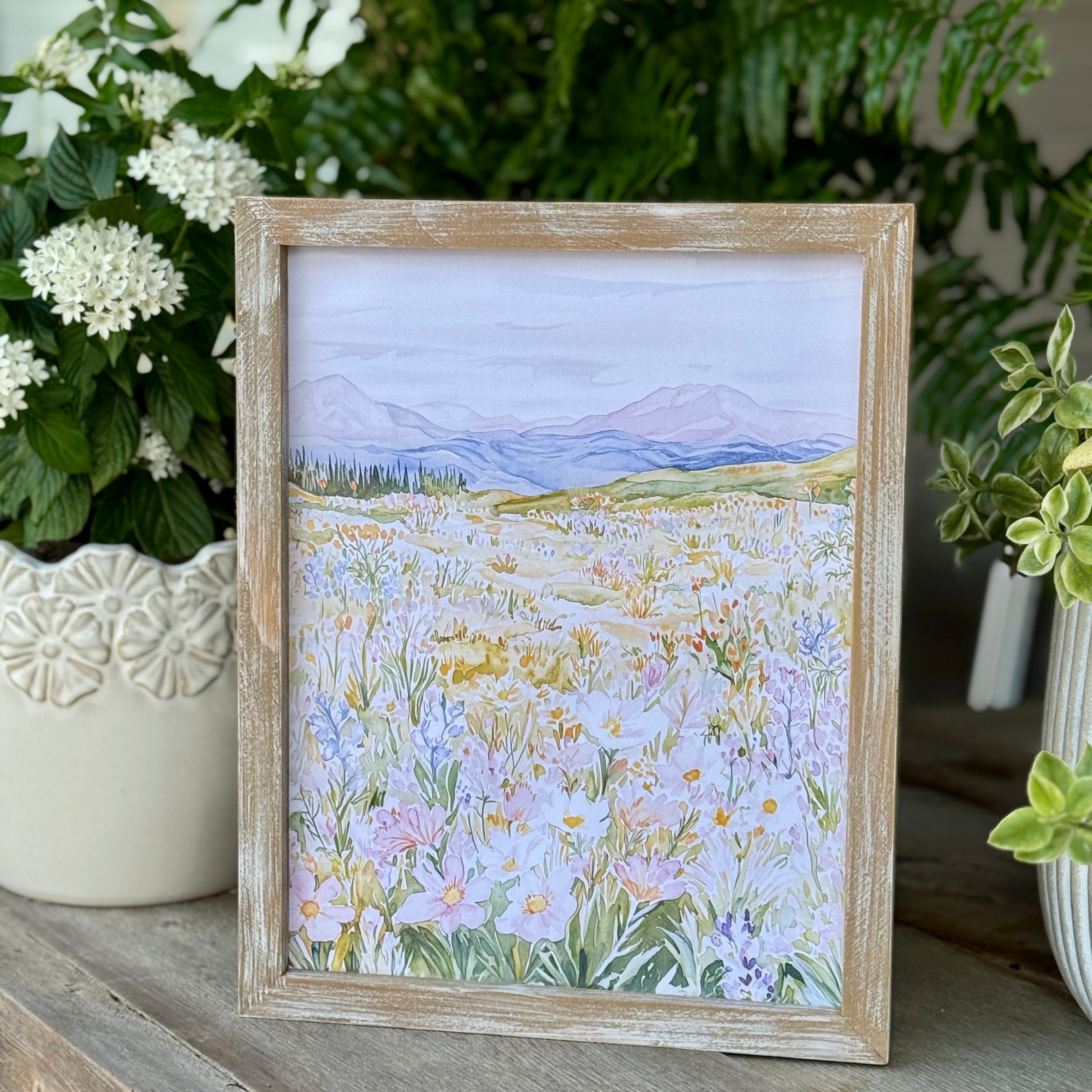 Light Barnwood Frame with Flower Field Artwork Print Inside, Sawtooth on the Back