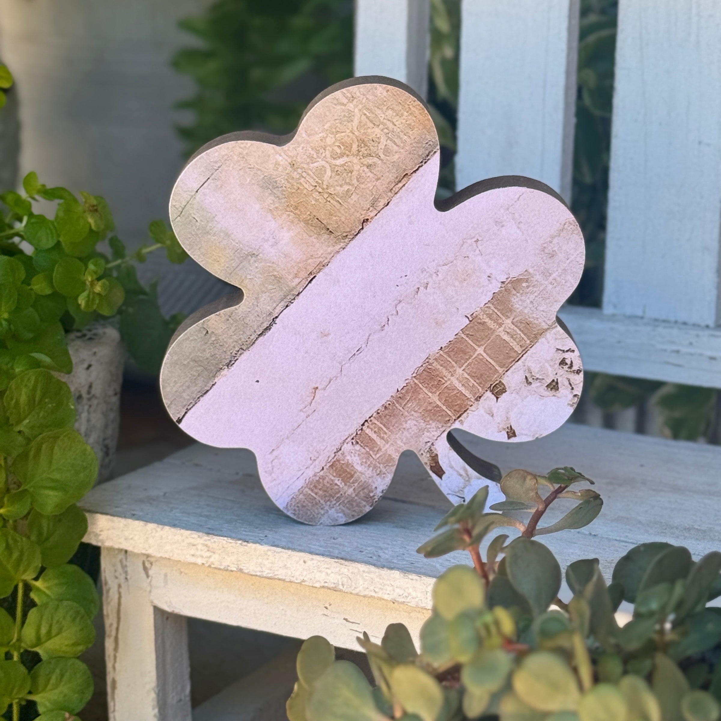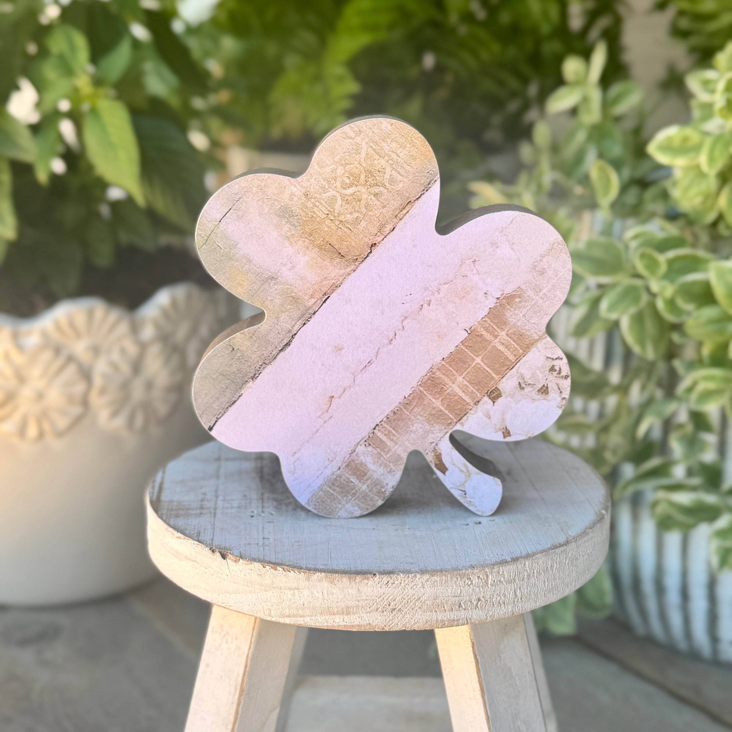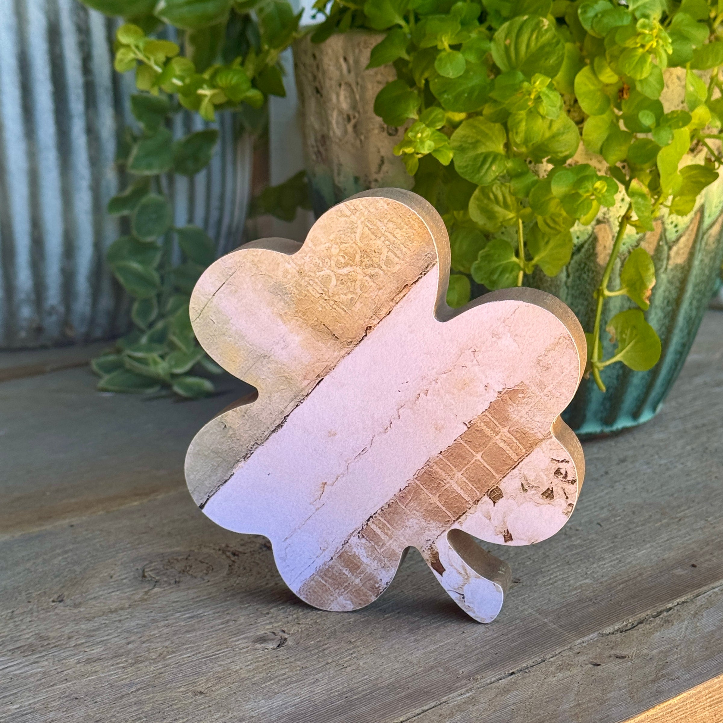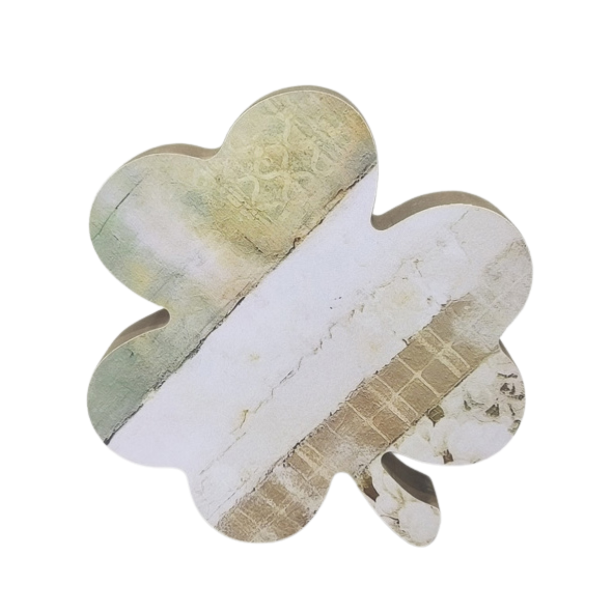 Vintage Washed Wood Shamrock Cutout with Irish Collage Artwork Print Attached to Front