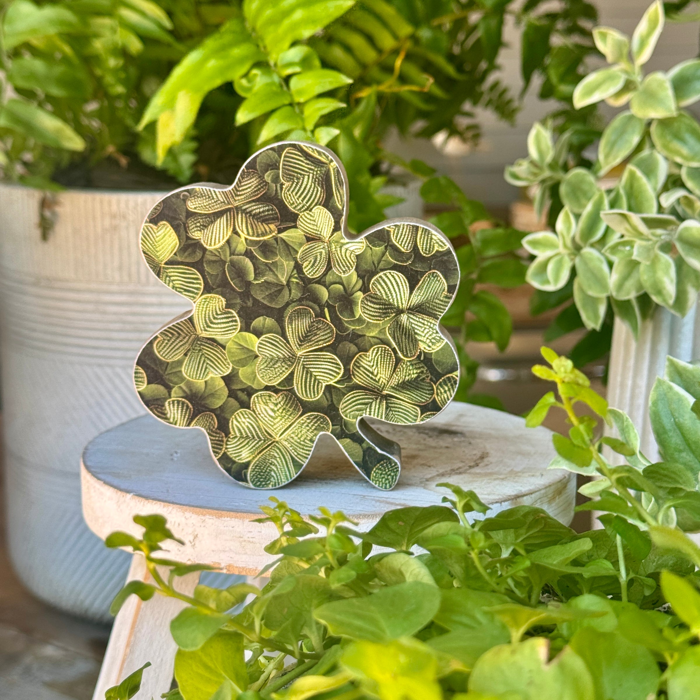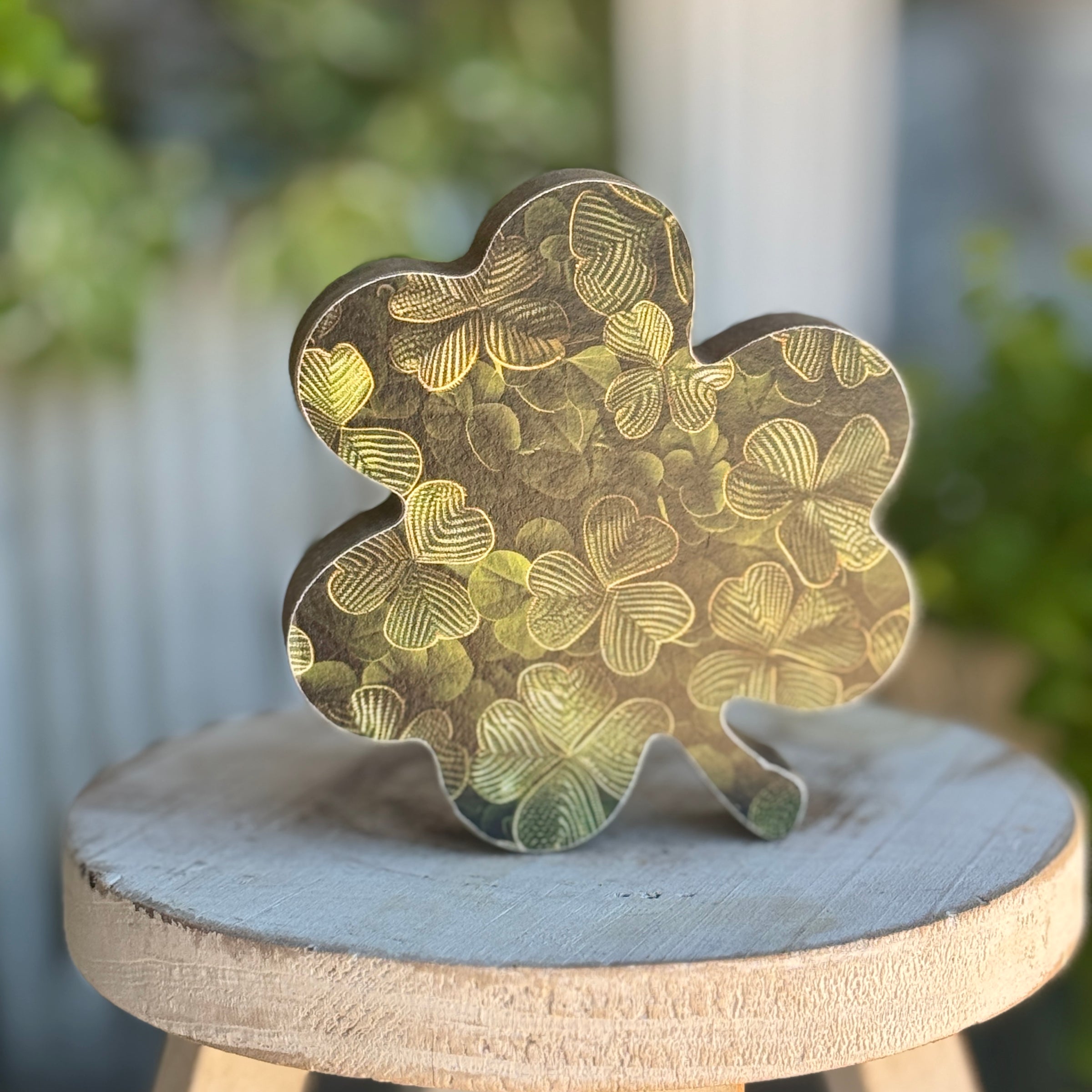Vintage Washed Wood Shamrock Cutout with Clover Artwork Print Attached to Front
