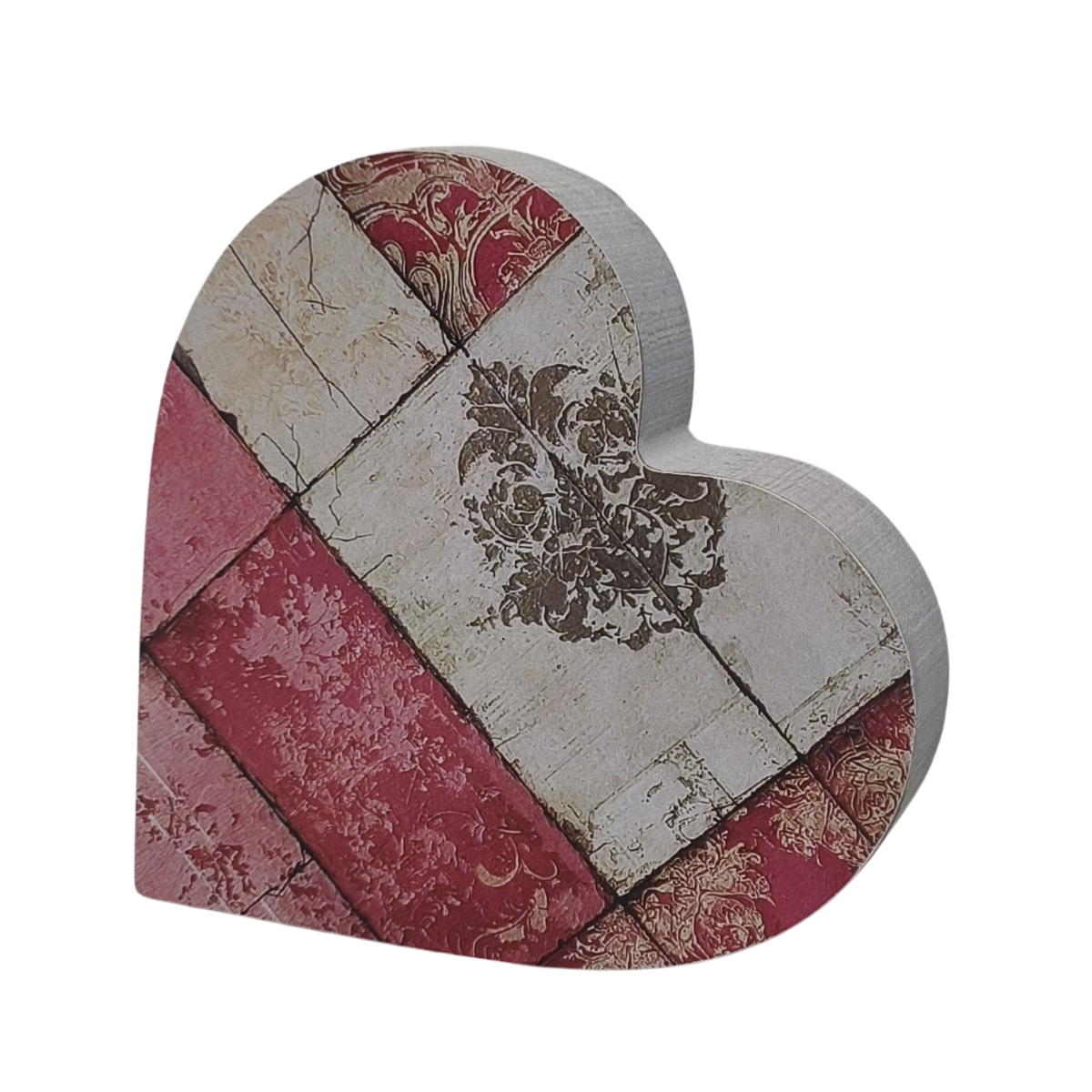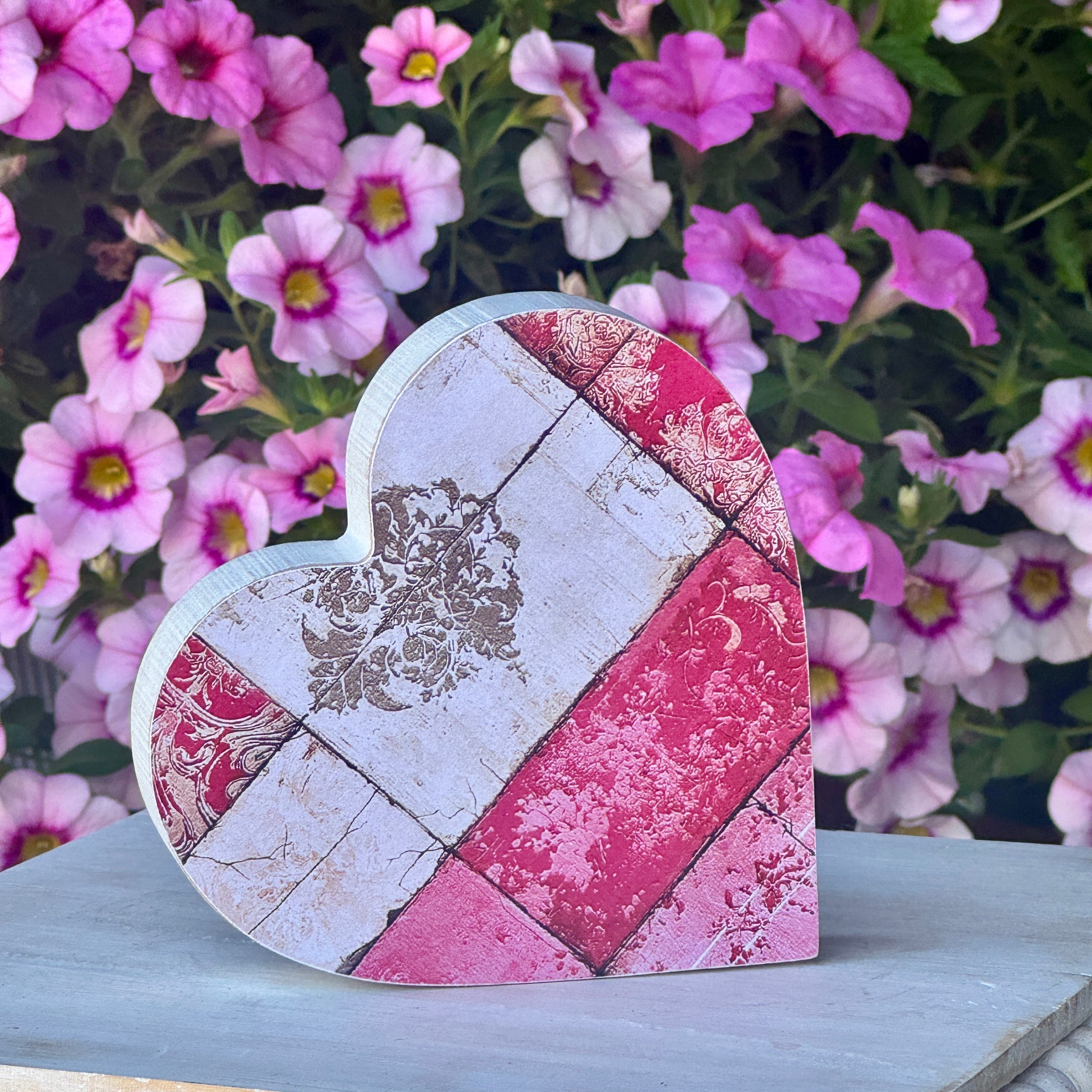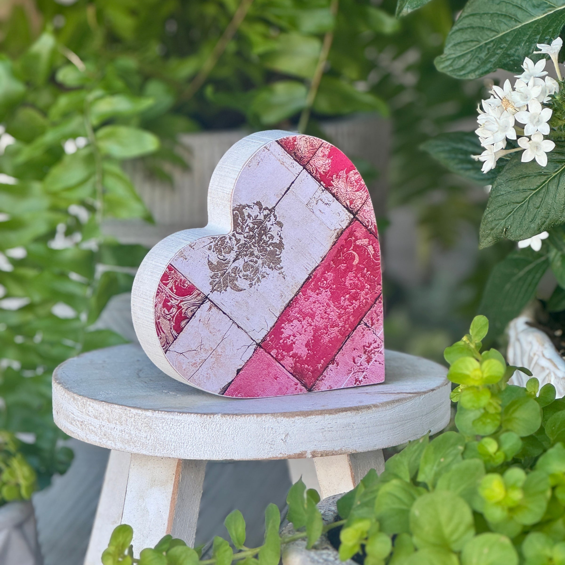 White Washed Wood Heart Cutout with Collage Artwork Print attached to Front