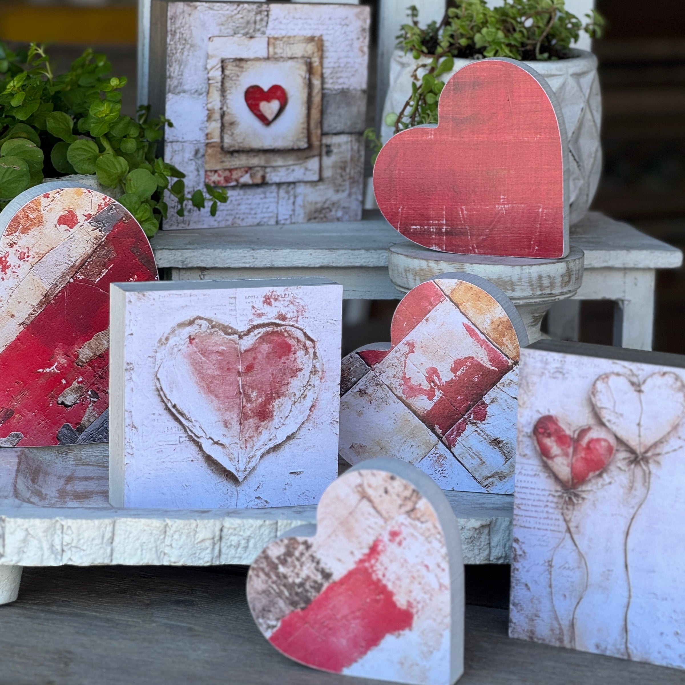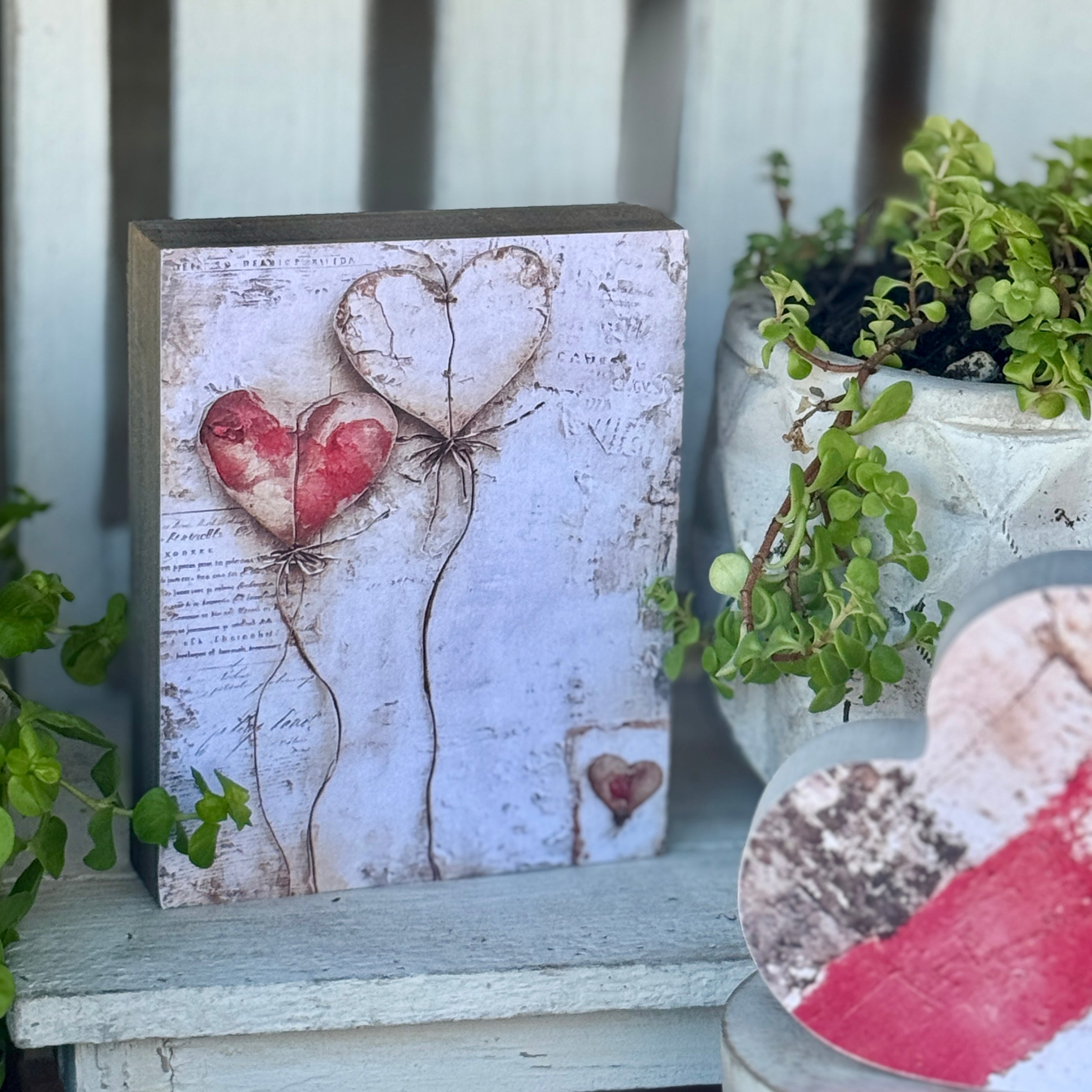 Barnwood Block Sign with Red and White Heart Balloon Artwork Printed on Paper Attached to the Front