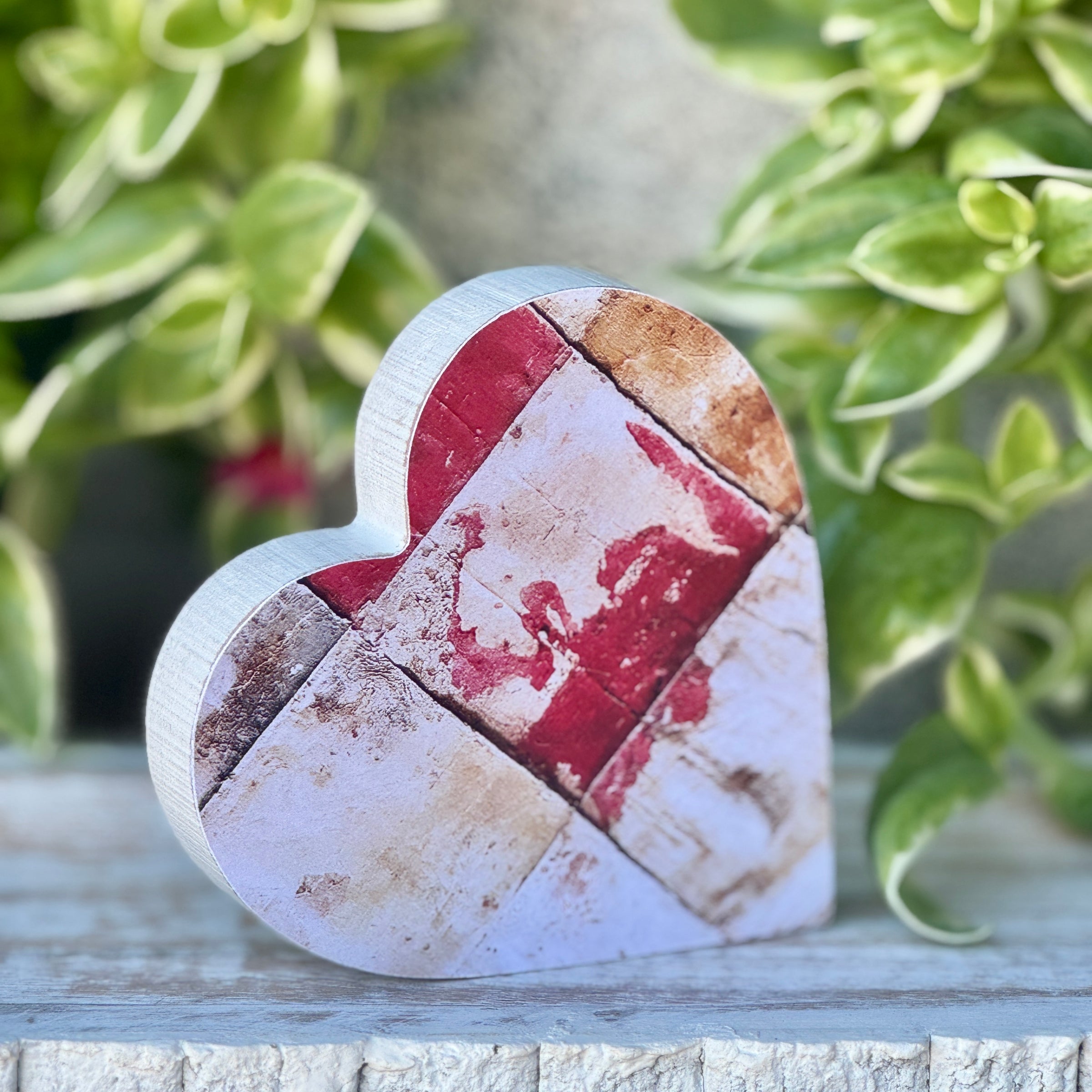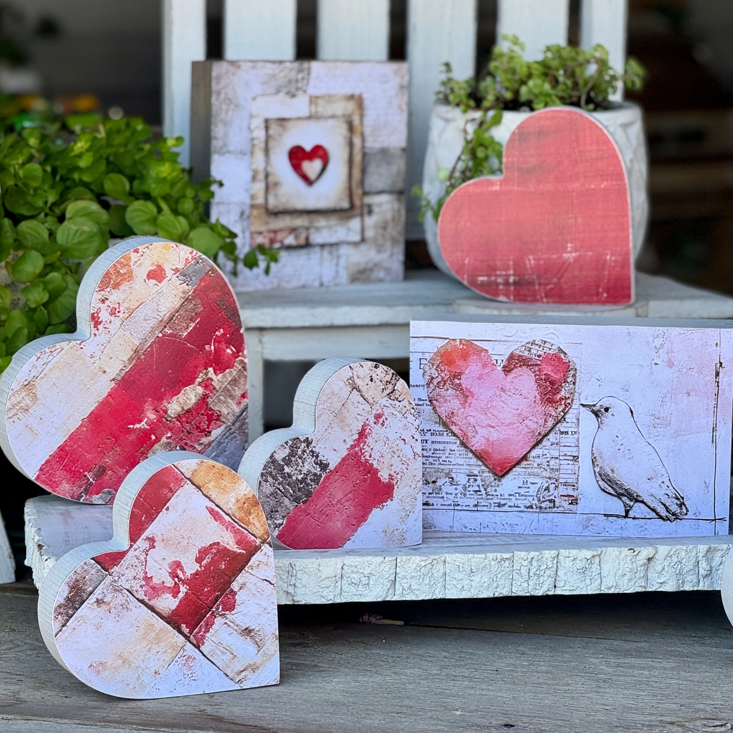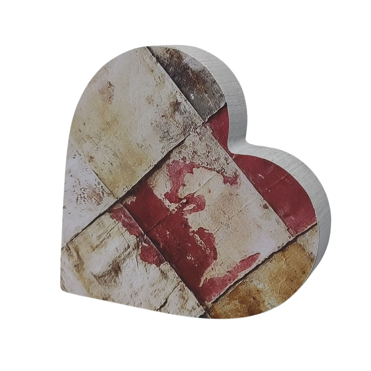 White Washed Wood Heart Cutout with Collage Artwork Print attached to Front