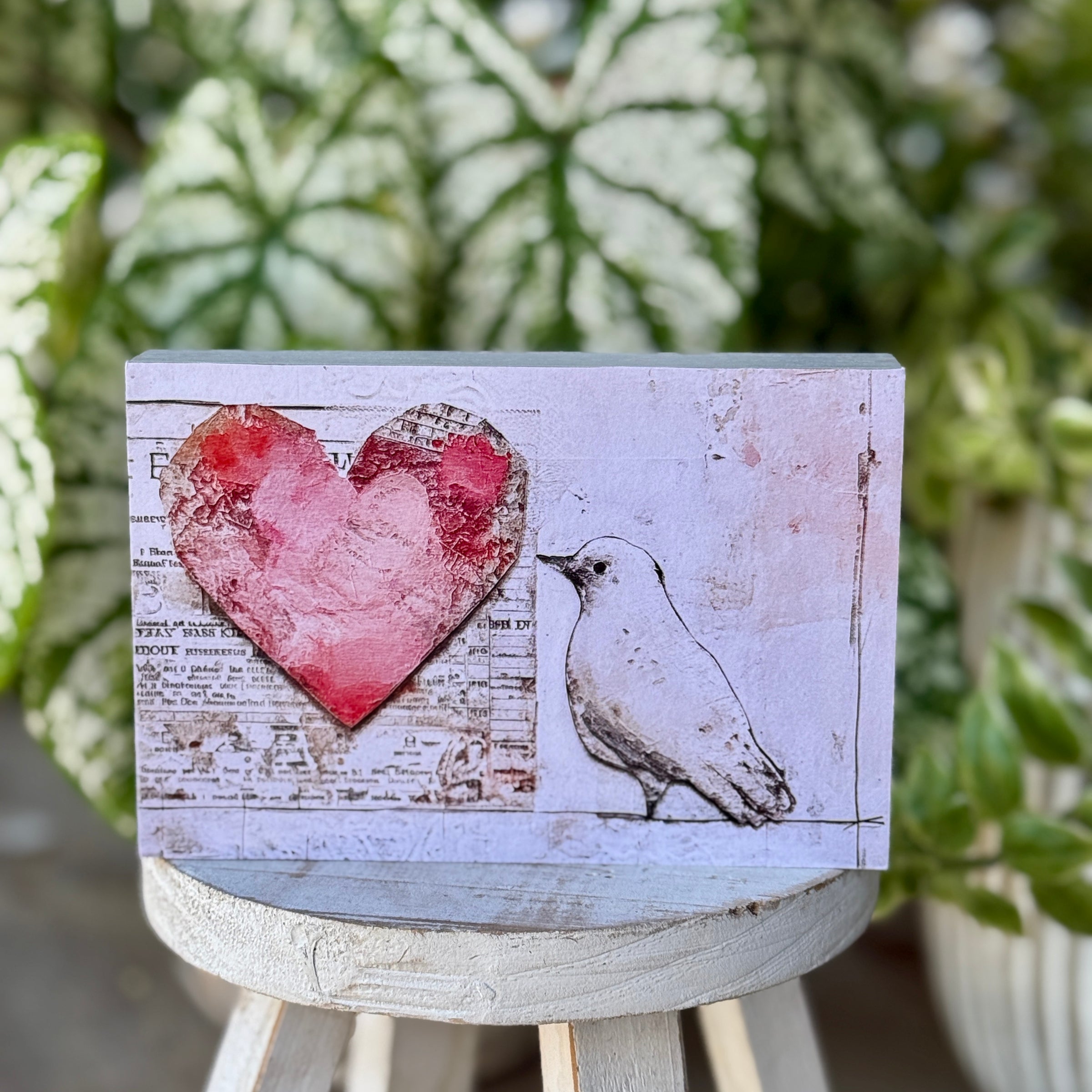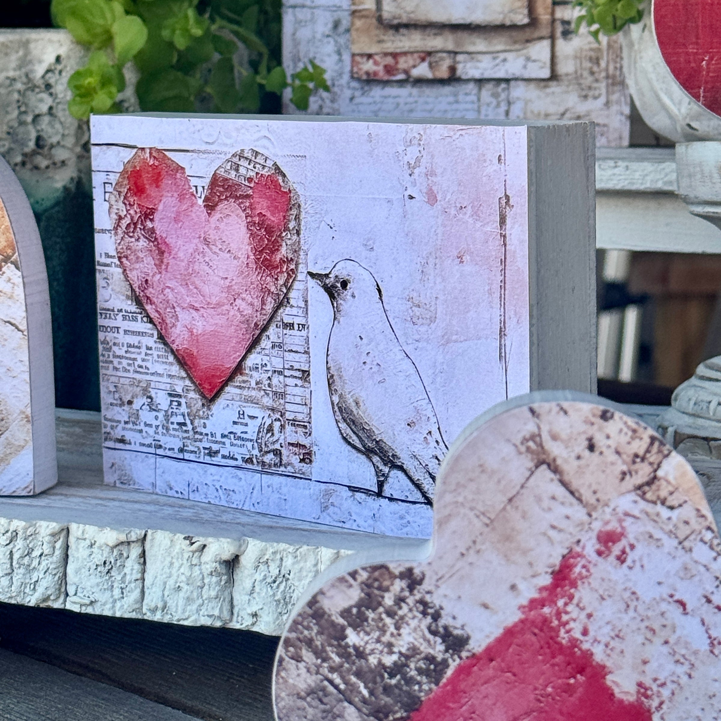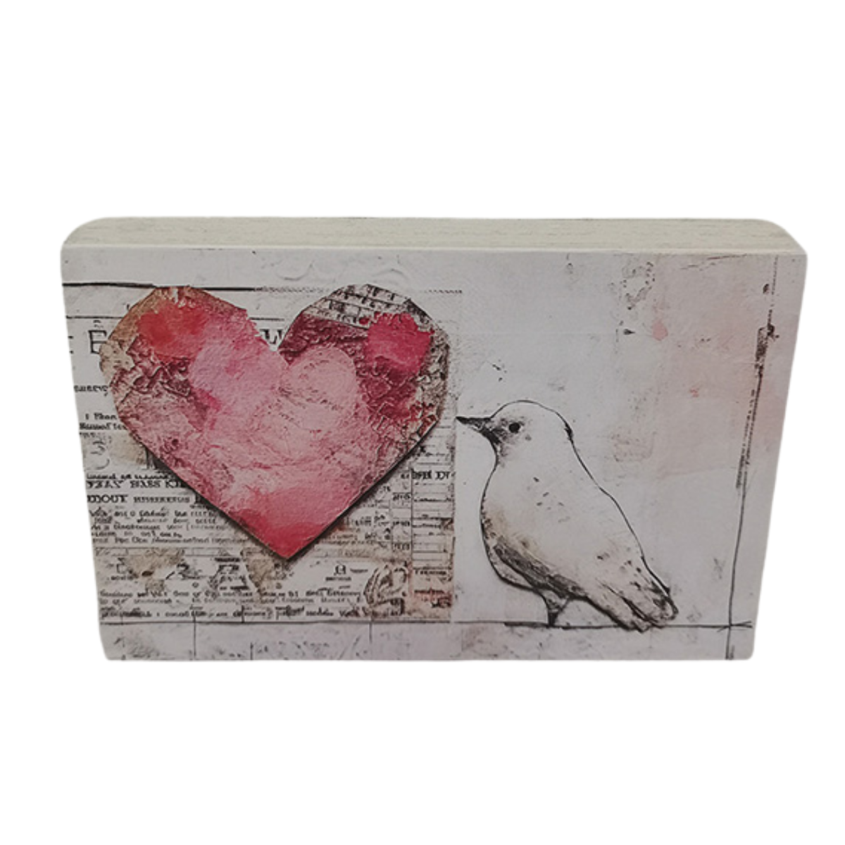 White Washed Wood Block with Heart & Lovebird Artwork Print Attached to Front